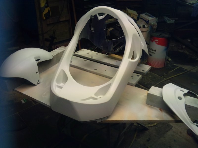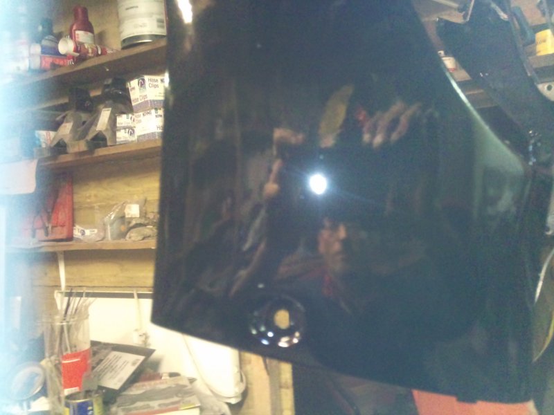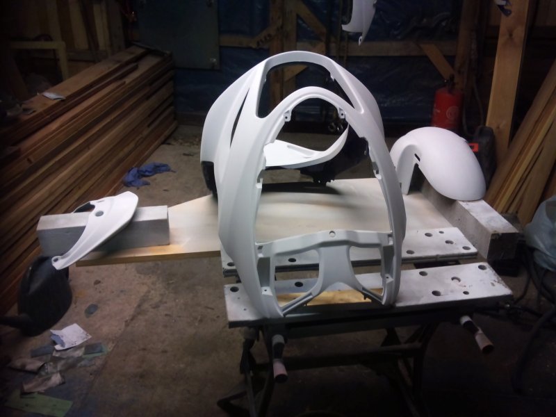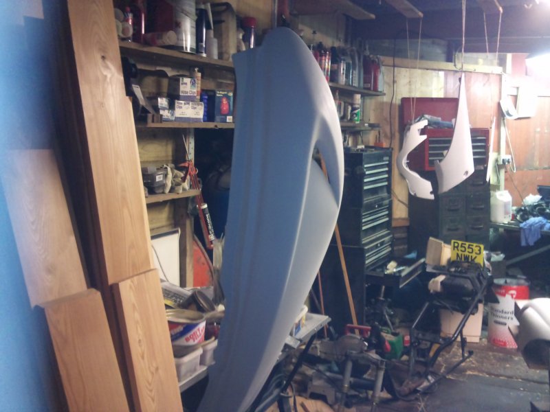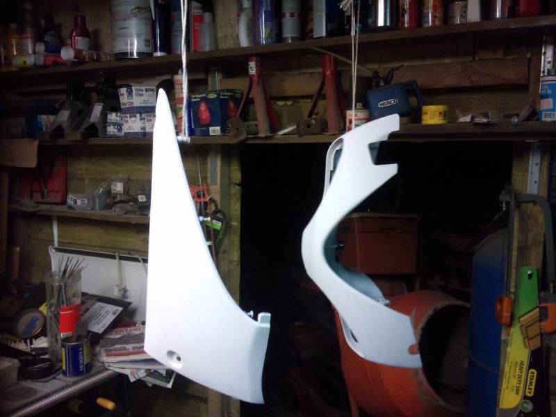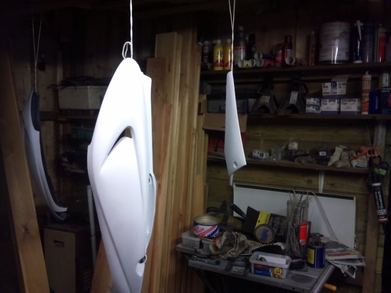 Well, I got the crank back from the shop, had a quick chat with them and it turns out that he doesn't like doing these cranks because it takes too long to balance them, plus, as standard they have no thrust washers each side of the conrod, which he also doesn't like. I'm sure if Suzuki thought that they needed thrust washers then they would have put some there wouldn't they?? Apart from that, it's fine. So at least I can start to build the engine back up again. So I spent all day saturday, and i mean a good 10 hours, rubbing down the panels. Halfrauds bloody laquer By the time I finished I had rubbed through the skin on two of my fingers! And one of those is the important one!!!!! Then all day sunday plastic welding, sanding down the welds, priming, sanding, topping up, sanding, priming........til it got here: Then some more prep work to the primer.........400 grit, primer, 800 grit, more primer............and all this whilst the bloke is here cleaning the carpets and rugs in the living room. Had to move the bloody lot of furniture out for him as well. And he wanted paying for it! Bloody cheek, should be grateful I gave him a job to do Not really, he done a great job considering I'm always in and out with my boots on. I digress; Scramble over the crap to the racks, grab the paint, et voila! I just noticed that if you look close at one of the photos, you can see my ugly mug in the reflection Not laquered anything yet but looking good so far. Still have the purple flashes to do when i work out how I want them, but that's in a few days time. Got the engine to rebuild and the wheels to do yet. Post again later in the week.