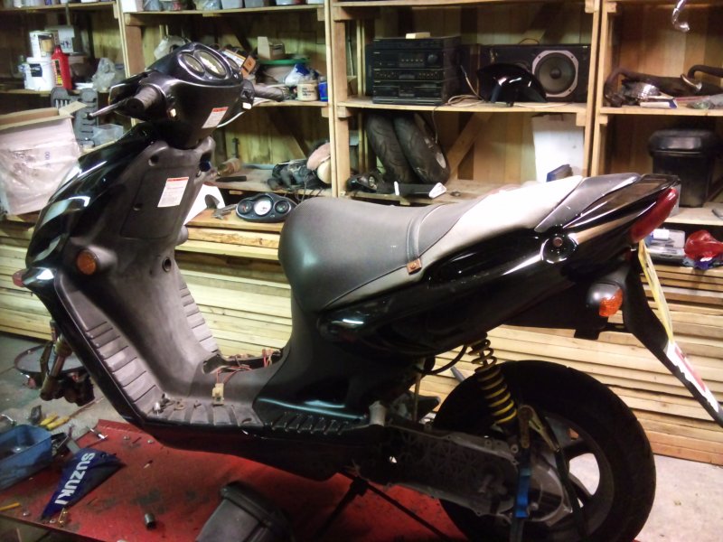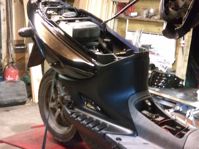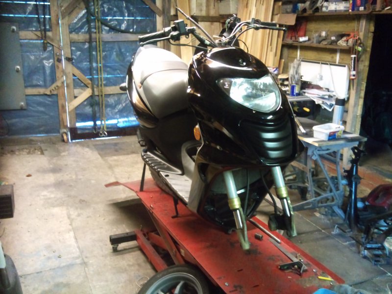 Hi Forde, I was going to do this one for myself, as a back up to my zzr1100. Something to use over the winter months. Might stand a better chance of keeping this one upright in the frosty mornings. Panels are expensive for the kwak. And seeing as i did that one about 4 years ago and it still looks good, i don't really want to send it down the road sideways. But I have been thinking about selling the 1100. I mainly only use it for work and back, 7 miles each way with the odd trip down the motorway for scooter parts. Trouble is I wont really save anything on costs. Insurance on the kwak is only £105 fully comp, £78 tax and £20 a fortnight in fuel. I really doubt if the insurance on the scoot, once it's modified will be cheaper, I know the tax will be, but the fuel costs will be about the same i reckon. And i love the power of the kwak. Scoobies, skylines, porsches, gtr's, I haven't come up against one yet that can beat it from a standing start. And trust me, around here in Birmingham, there are plenty that think they are fast; until they become a speck behind me.