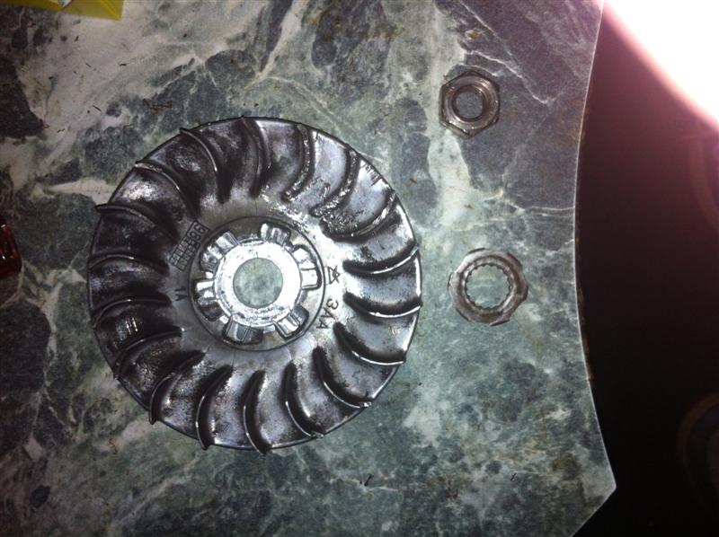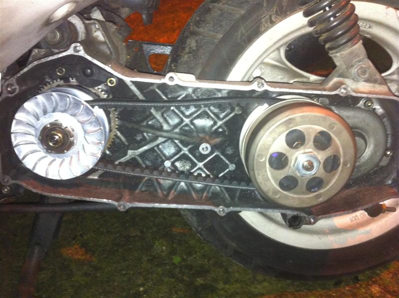it didnt have a washer there, its got the sleeve, variator face plate, star washer, kick start gear, large washer and nut. Here a pic of the first face plate after the belt snapped and the second one is after i replaced it (the belt hasnt been tighted up in the pic)