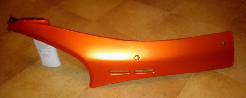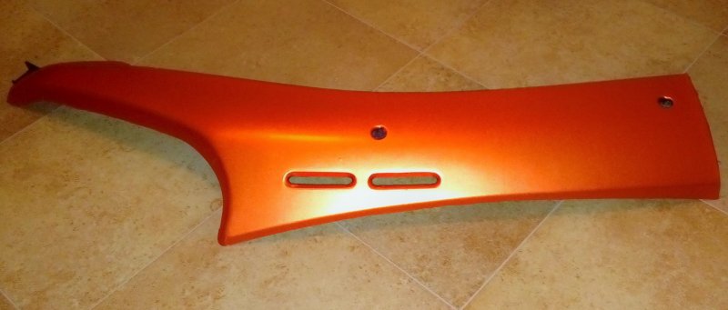 Vinyl turned up 1ftx5ft in a roll and not folded sheet. colour wise its more a matte burnt copper than a matte chrome orange but it looks nice. got a couple of old bust up floor runner panels i will skin first see if it looks ok, then i will main order in 4x 2x5ft rolls ( should be enough to do the whole panel set ( front-wheel fender-wheel scoop- floor runners - body sides - rear tail /bodyside joiner) just one runner panel done in the matte chrome orange, i really do like this colour myself, laid on without NO HEAT but its got some faults so next time i will run a hairdryer/heatgun to help conform it and remove kinks and bubbling