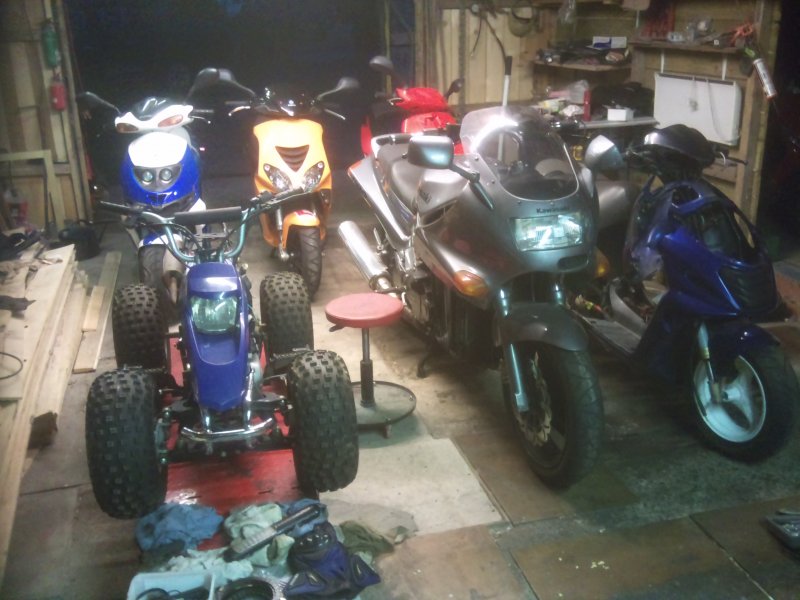 Thought I might share this little lot with you all. Finally got out the workshop at 9:30 tonight............knackered........too lazy to eat so battered the chocolate chip cookies instead. I gotta move stuff out to do any work in here! By the way, can anybody identify that little quad bike. A customer bought it in and asked if i can get it running for his 5 year old son. I ain't got a clue what make it is and half the damn thing is missing so i've not got much to work with.