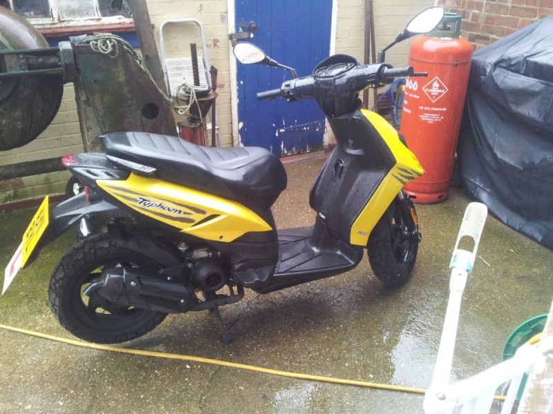 Just got my first ped a couple days ago. 2011 Piaggio Typhoon 50. loving the look of it and the fact it's pretty beefy for a 50. Not really new to bikes as both my parents ride so have been pillion a lot. Just glad that I can get about myself now. Do want to make it a bit faster. Will probably start with the washer in the variator and taking the restrictors from the exhaust. Not got a lot of money so a bit limited on modifications at the moment but at least it will help a bit. And here's a picture of it. This was taken when I got it home. Was raining and not a good picture as that was before I put it in the garage.