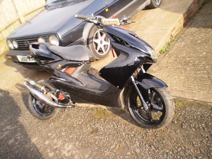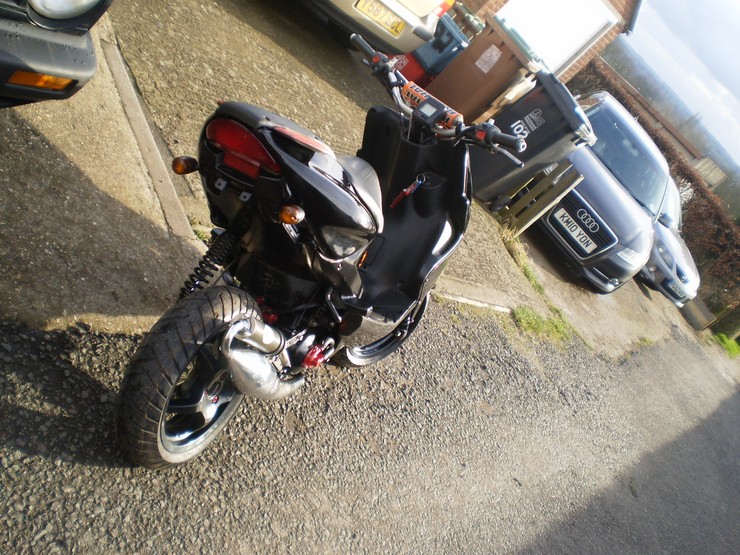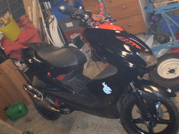 Re: my aerox nice job, im a big lover of the aerox :cheers: what ive done to my aerox, - respray - british racing green - resprayed wheels - black with polished outer edge - lots of racing stickers :grin: - 70cc polini bore kit - 21mm polini carb with uprated jets - polini air filter - athena unlimited rev cdi - lighter rollers - gear up kit - racing clutch - electic water pump ( suprised at power gain :blink: ) - new clocks - with blue LED's now all i need is a new F***ING exhaust, i broke mine :rotfl: