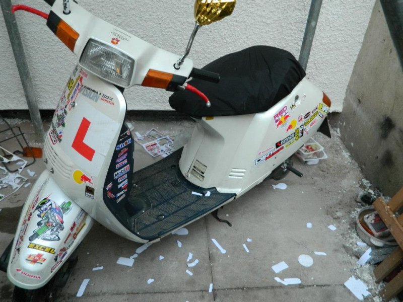 the stickers were just a sticker kit off ebay, tbh they were to cover up a lot of scratches and now im more into the odd sticker in discrete places and that's it. wheels are hard to find I had the experience of sourcing two last year the potholes sticker was given to me by the gfs mother who liked to criticise the way I dodged all the potholes/speedhumps/crap in the road whenever she followed me. tbh wouldn't bother tuning one of these unless you can get a spare engine, although I have been told a speedfight2 exhaust will fit these not 100% though, never had the desire to make my visions go faster lol I was the one who had the last laugh when she needed the suspension doing on her car and she came to me for it to be done