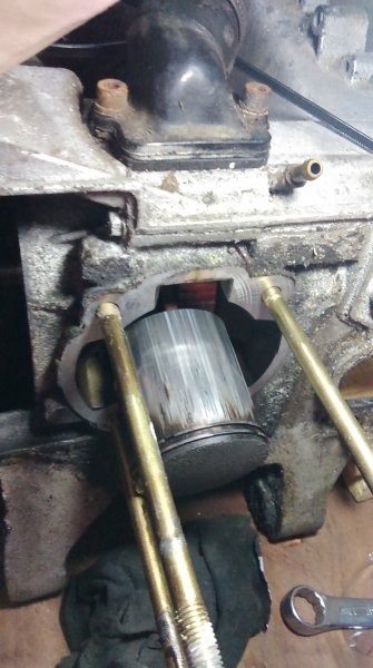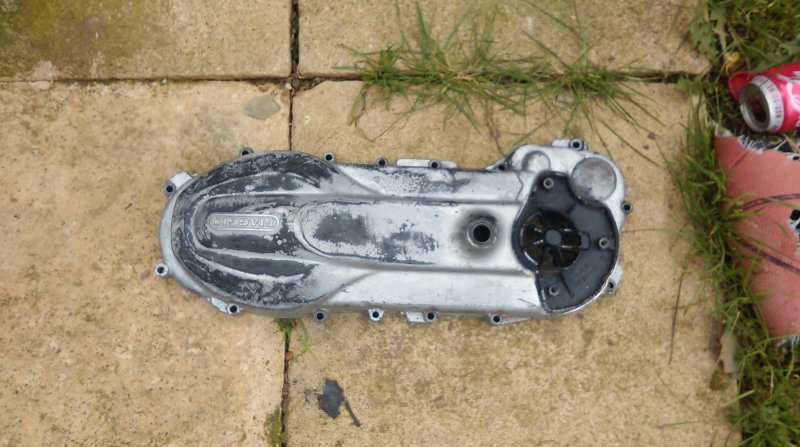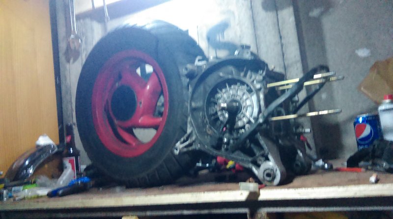 So wide awake and phones on 83% battery So I got up to the engine well as any thing I took transmission cover off to see the damage to the splines on the crank and again and just getting to it found some nastys This is pitted way to much to use would just keep shredding belts so fit for the bin (obviously not the clutch) and then some pitting on vari not good but still 130 quid bike what do I expect So after checking all them I whipped the top end off so I could split the bottom end to be fair the bore is still in useable condition well the bike was running when put away but was put away a long time ago The piston is worn and was probably on its way out and the head was fine just carbon deposit and tiny bit of detonation So with all that off the big end on the crank in fine I just need a proper look so I split the cases Right now wouldn't advise useing this crank again as it is pretty worn but as I have 4 engines with 4 standard 125 bores I'm gonna go mad and build something to muck about on hey will cost me nothing why not And way so all that split and done at the time I didn't have 4 engines this was my only one So I brought a near perfect engine off eBay for £200 as it had all the transmission as well so worked out cheaper then me buying new crank bearings variator rear pulley so yer I brought that But the idiot didn't pack it very well and the bottom mount snapped in delivery so he knocked off 40 quid still gutted tho Can't get any other pictures at the moment but if you look at the bitten left of the engine you can see where it snapped so iv got all the internals and a spare top end for my other cases that's sweet and for ;£160 so still doing good so I thought I'd treat her as price was still low to a BOMB PROOF scorpion second hand no dent or dinks £70 but got lied and it had no baffle in it but still good nick So I got creative and am in the throws of putting the red pm end can that came with the bike and modding it to fit the scorpion exhaust So any way this has taken me half hour or so to do this i ill carry on when I have time got to get ready for work Peace out If any one is actually reading this