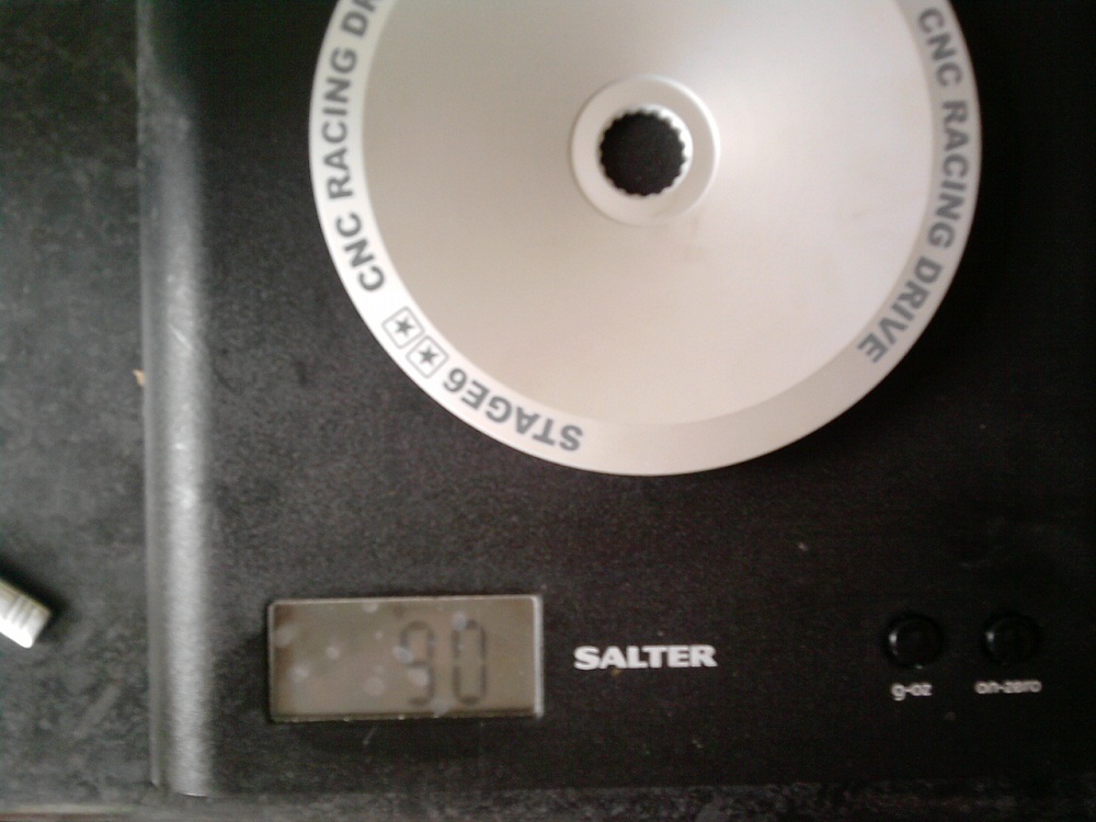 Did a write up myself about these: Stock - 261g Malossi MHR - 99g (http://scooterbits.co.uk/product/Ma...c_Front_Pulley_-_Without_Electric_Start_Gear/) Stage6 - 90g At first glance it would appear the Stage6 is the winner, in weight terms anyway. However, it is the only one without cooling fins, so I added the one off the old drive face (does work, done it myself) and weighed it again - 111g: