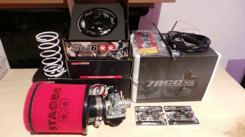 i have a sym jet sport x sr 50 (2012), which i bought from new a year and a half a go, i have recently purchased these parts: -Polini variator, -Leo vince zx-r, -Stage 6 street race 70cc, -Top racing crankshaft, - -Stage 6 clutch, -Malossi 19mm carb, -Stage 6 big filter, -1500rpm torque spring, -Motoforce clutch bell, -Stage 6 roller weights(4.75), -Malossi bearings and oil seals, -Malossi primary gear up kit,,, -All purchased and sitting here, just waiting for my local mechanic to give me a date for it to be fitted, -Total cost came to around £650, plus £200-£250 for fitting. and i am wondering what speed i should expect?!? thanks....