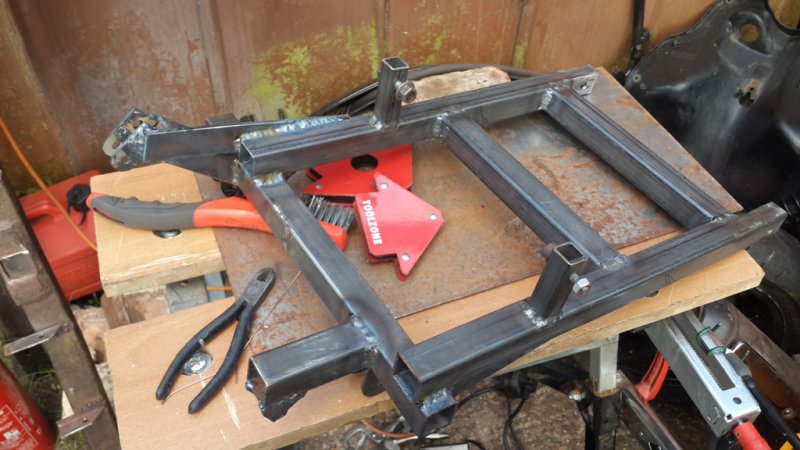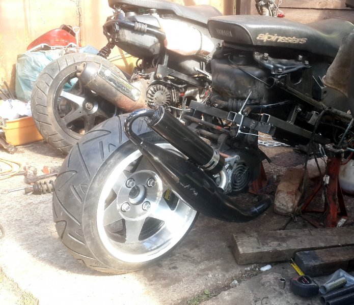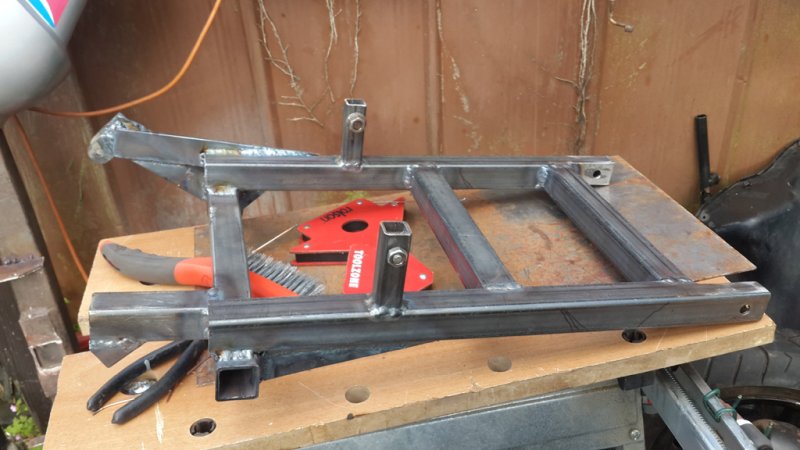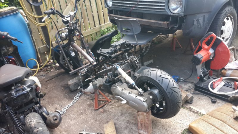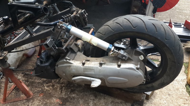 been a while since I've been able to post any progress - had lots of non-bikes work on :-\ However...I have not been idle, just too knackered to post pics after being out working on the bikes. The larger diameter rear shock finally arrived from china, and I've adapted where it connects to to give a steeper angle and the right amount of throw to take the bike from on the deck to riding high (as high as it can go without the auto-choke fouling the frame anyway). It's set so that when it's riding on the bump stop it's bottomed out so that if there's a loss of air-pressure while riding, I'm not suddenly gonna be dragging the exhaust pipe. That wouldn't be good. There's now a rubber bump stop in place of the spring. That said when it's aired down it's **low** it looks a bit deceptive in the pic below because the frame is on axle stands so that I can adjust the rear wheel up and down to get the measurements right, but when it's actually supporting its own weight and on the bump stop it's proper slammed. But when it's where it would be when "aired up" it's at a nice usable height so should be plenty of clearance for potholes, kerbs etc. It's a good range of motion and only uses about 1/3-1/2 of the stroke of the air cylinder. Latest mission was getting the stretch frame off and properly welded up so that now it can support its own weight. Not the most beautiful welding but it's all TIG welded and I've gone from strength over prettyness. Some fo the welds need dressing a bit and a couple of ends need trimming back slightly, and a couple of the open ends will get capped off for neatness but the basic structure *works* and is now back on the bike. Next up I kinda need to see it supporting its own weight so that I can extend the fairing bars rearwards and have them rejoin the frame but obviously I need to see it at a "natural" angle so that the lines all flow right. Then I can weld up the fairing bars & cross bar too (it's all just tack welded atm). I also have to finalise the lateral position of the exhaust & mounts so I can weld in the little extension so it clears the wider rear wheel properly...which is gonna be a tricky one, but should hopefully be the last of the major metalwork. I've also dismantled what I'm hoping to use as the air pump (was a tyre inflator) but it needs building into a case along with some sound deadening to make it quieter and more or less weatherproof. That's gonna be fiddly too I think. I've still not quite identified what threads are in the air cylinders which is kinda annoying, I'd rather re-cut the threads on whatever fittings screw into the cylinder than re-thread the cylinder itself but that's only gonna happen if i can figure out what thread it actually has. The ebay description seems a little..er..wrong.