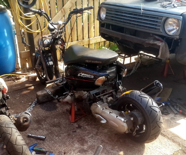 she runs! (again) \o/ i've been a bit at a loss of where to start to get this old girl moving along - so many things to do it's tricky to prioritise, especially as many of them require money which I don't have currently. But it was sunny out and I had the day to tinker so dammit I was gonna do *something*. I ended up moving the coil with a vague view to trying to get her running (again, after the stretch), since that's a fairly major milestone and all the rest isn't much good if that bit doesn't work. as it turns out as well as the coil I only needed to extend a couple of wires and the oil hose (18" stretch) and she fired right up. There's only the stub of the exhaust on at the mo so it's super loud but it runs. Welding in the exhaust extension is on the to-do-soon list. As it is the throttle cable doesn't reach but I could blip the throttle by yanking at the halfway-point on the cable by hand. What is strange is that the carb now pisses petrol out like it did when I put it on the other bike, and I'm sure it didn't do that before. I've not relocated the carb on this stretch either (which I thought might be the cause on the other bike where I had to move the carb). In fact nothing's changed other than the motor is 18" further back than it was..but now it leaks. hmm. Maybe it did before but I didn't notice it though it's quite a significant leak so I'd have thought I would have spotted something that obvious. Even with the airbox on it drips out the bottom of it. I wonder if it could be something to do with the (now) excess fuel hose and the relative change in position of the fuel tank? Seems like a bit of a long shot but there's not really much else which has changed. weird. I'll figure it out eventually.. EDIT: been reading about carbs and I think the pissing fuel thing is to do with float levels - maybe something got upset in the swapping carbs around. will test the theory next time I get the chance.