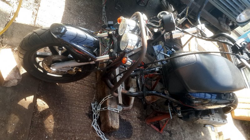 Been a bit slow going on this recently - work's been swallowing up my spare time...however.. One of the challenges I've been facing is what to do with the threads (for the air fittings) on the air shocks since I've not yet figured out what thread they are, and the thread the ebay seller says they are, they're almost definitely not. However today I accidentally discovered that the shock ends actually unscrew from the body, which means I can take the ends off, re-cut the threads to something useful like 1/8 bsp (like the rest of my fittings use), clean out any swarf/shavings and then reassemble the shock. I wasn't wanting to try to re-cut threads in situ since there was the likelyhood of metal shavings making their way into the air part of the cylinder...which would obviously be a bad thing mmkay. Once I've got the shock working on the right fittings I suspect it might be an idea to loctite the threads of the shock body so that they stay screwed together. That's not something I'd want to come apart while riding. I've also ordered a bunch more tubing & bends so that I can extend the fairing bars rearward and tie them into the frame, thereby hopefully bringing the front and back halves of the bike together and giving a bit of visual/design continuity as well as producing a nice stable platform for my feets while riding. Obviously this wasn't something I could really do till I had the stretch frame figured out though. The plan is to put some checkerplate down over part of the bars so that it all ties together nicely. At the moment the stretch frame is very much "functional" rather than pretty, but once I've got the fairing/foot bars in place and the exhaust mounted I'll look into the more aesthetic aspects and hopefully "blend" that somewhat with the surrounding metalwork. pics as I have them btw I've also done a couple of catchup videos which I've posted on youtube. There's more to come and I'll drop them in here as I finish them...