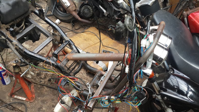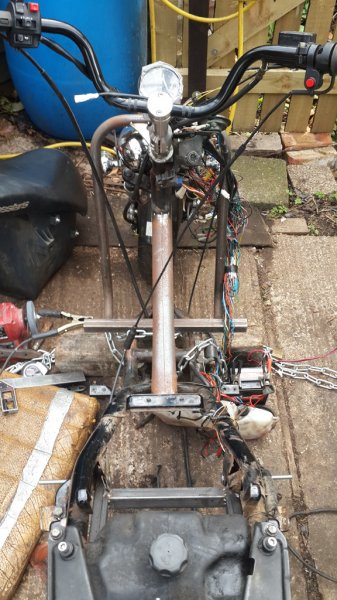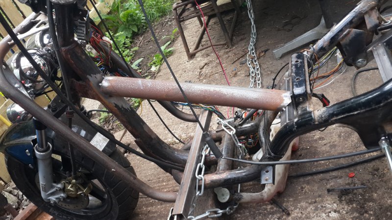 am still waiting for the bigger rear shock from china so wasn't much I could do on the neos this weekend, but I did get the cross-bar fitted. It's a nice 2" section of exhaust pipe which will give me ample room to route all the cables to just where they're needed. Given no fairing etc there's going to be a little box mounted to the side of the neck area which will house all the electronics, and the placement should mean all the cables can go from there directly into the crossbar with minimal fuss and be mostly invisible. Where bottom end of the bar meets the cross-bar i've deliberately left a slight overhang to the top since that's where all the cables will come out..
