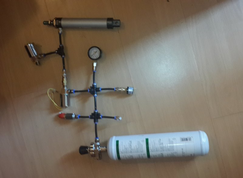 air-ride system finally almost complete I'm just waiting on a 1-way valve for the pump (open connection bottom right) and have to extract the pump from its current location (in a tyre-inflator type thing). from the top down.. - pneumatic ram - "air-down" solenoid - "air-up" solenoid - pressure gauge - safety relief valve - pressure switch (to switch the pump on and off between 90-100psi and keep the reservoir at pressure) - pump in - reservoir The order of a few of the things will perhaps change depending on how it works in practice but that's roughly how I think it's gonna work.. May need to add a variable valve to the open side of the "air-down" solenoid to control the rate of descent. Ditto the valve on the welding cylinder/reservoir should allow me to adjust the rate of "air-up" speed. I'm wondering whether it might be possible to add a pressure adjuster (like found on any compressor) to set the actual system pressure and thereby the ride height. Then I think it would only need one button to control - up (to set pressure/height) and down. Depending on how it performs I may add another tank just before the cylinder to act as an accumulator, but I've got a bigger ram on route from china so that may not be necessary. Obvs this would need expanding slightly if I add the air-ride to the front and the air-operated "feet"/stand, but I've not figured that side of things out yet. That's the theory anyhow!